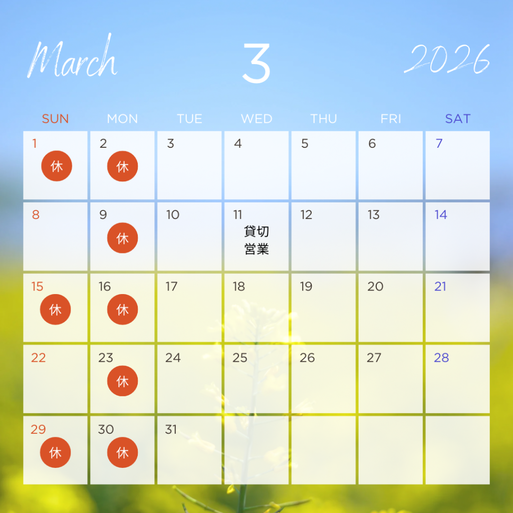 📅【3月の店休日】1日(日)2日(月)9日(月)15日(日)16日(月)23日(月)29日(日)30日(月)